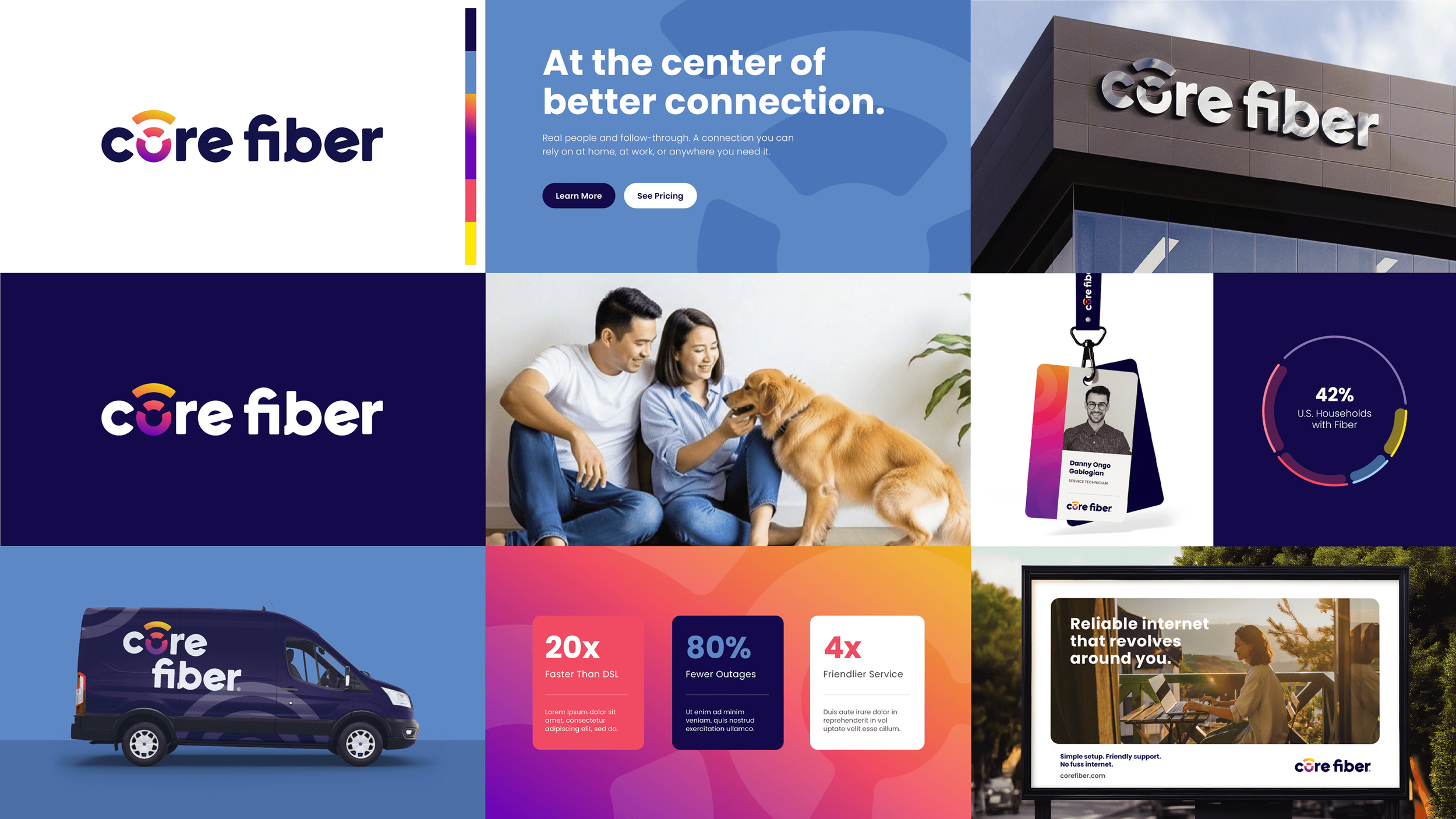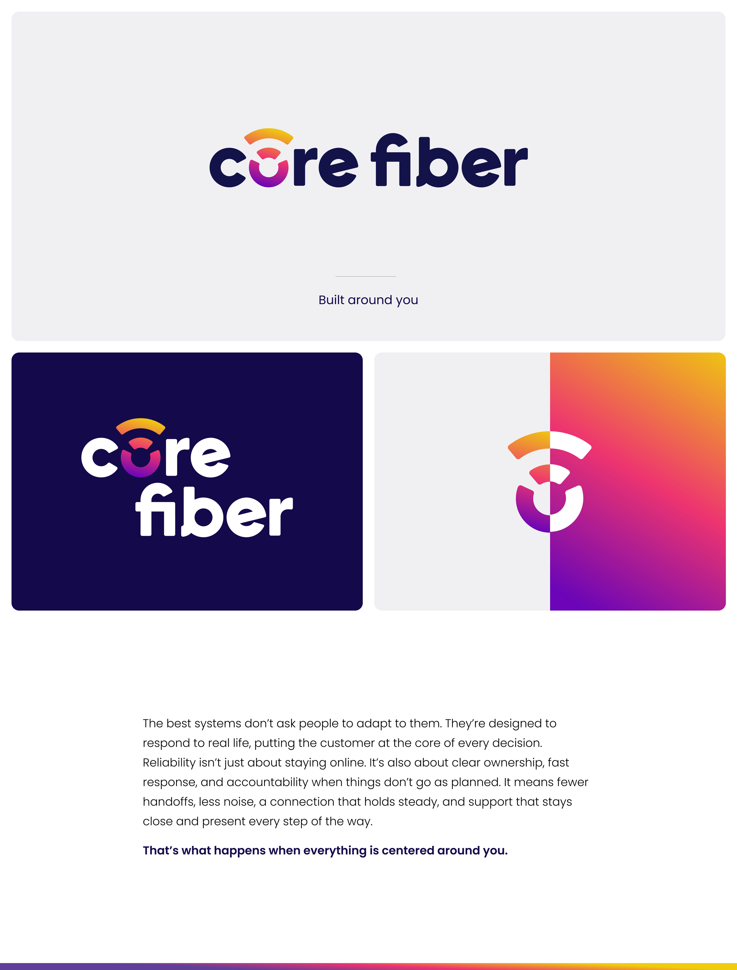 For the logo, we developed a custom type treatment for the wordmark that strikes the balance the brand demanded — modern and clean, yet warm and reliable. The trademark grew organically from the "O" in Core, where we crafted a mark using lines that reference wavelengths, broadband, connectivity, and energy — a subtle but meaningful nod to the communities it keeps connected. Nothing arbitrary, everything deliberate. The color palette was chosen with the same care, landing on tones that evoke friendly warmth while remaining bold and distinct enough to cut through the competitive landscape of corporate telecom. The result is a brand that doesn't just look the part but feels like Core Fiber.