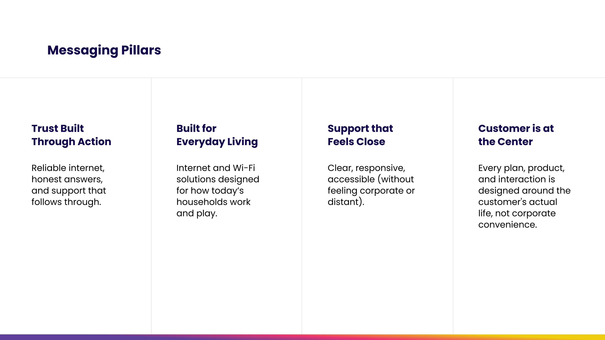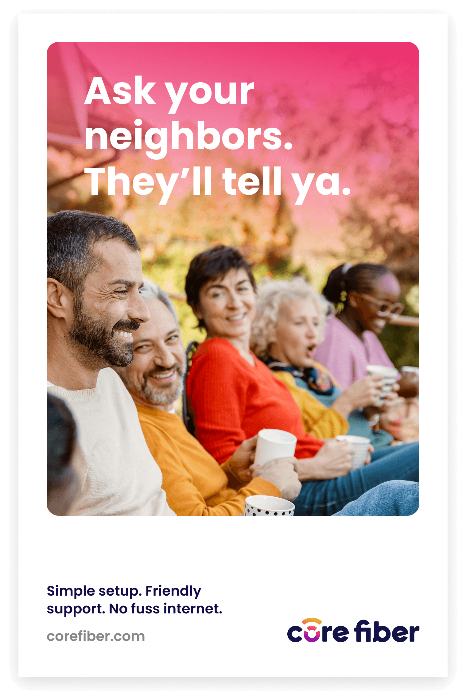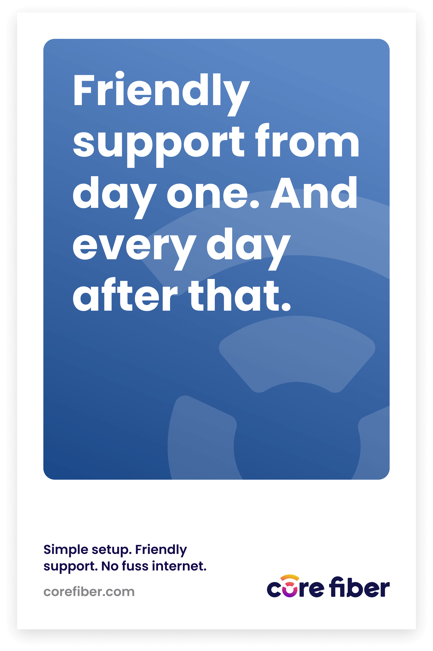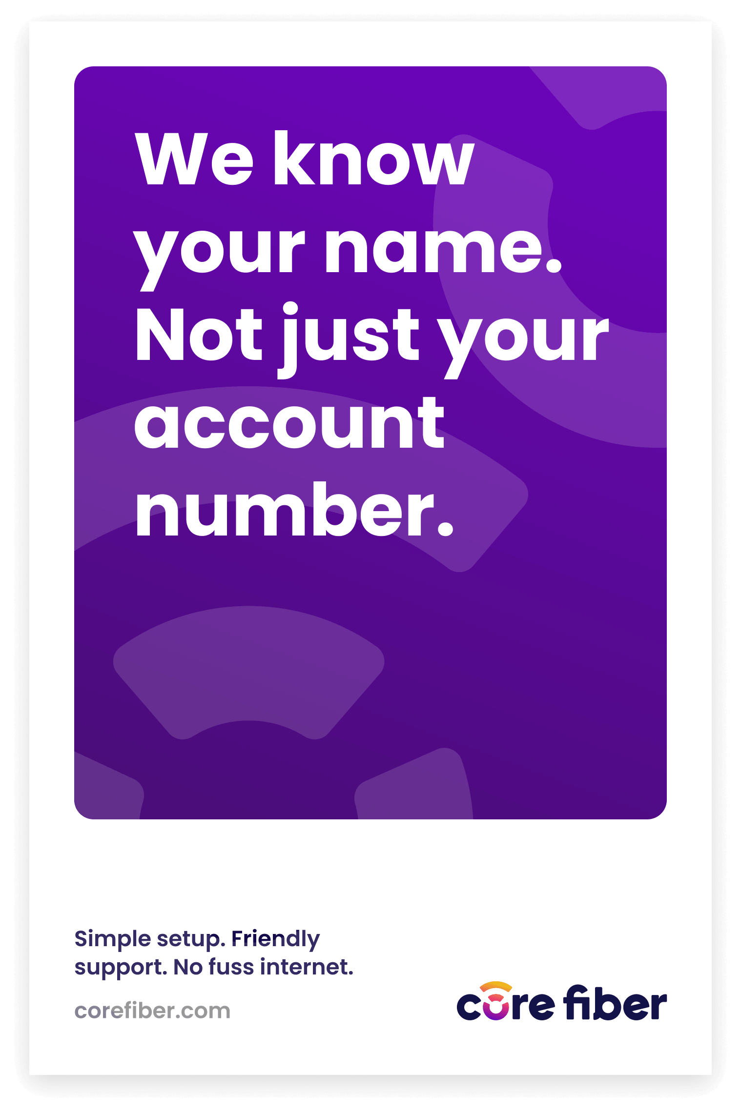 In an industry notorious for fine print and corporate-speak, Core Fiber needed to sound different — like a neighbor explaining something over the fence, not a telecom company burying info in a terms and conditions document. The messaging feels approachable, trustworthy, and consistent enough to reinforce the brand. No jargon, no filler, just honest plain-spoken communication that reminds customers Core Fiber is always close by.