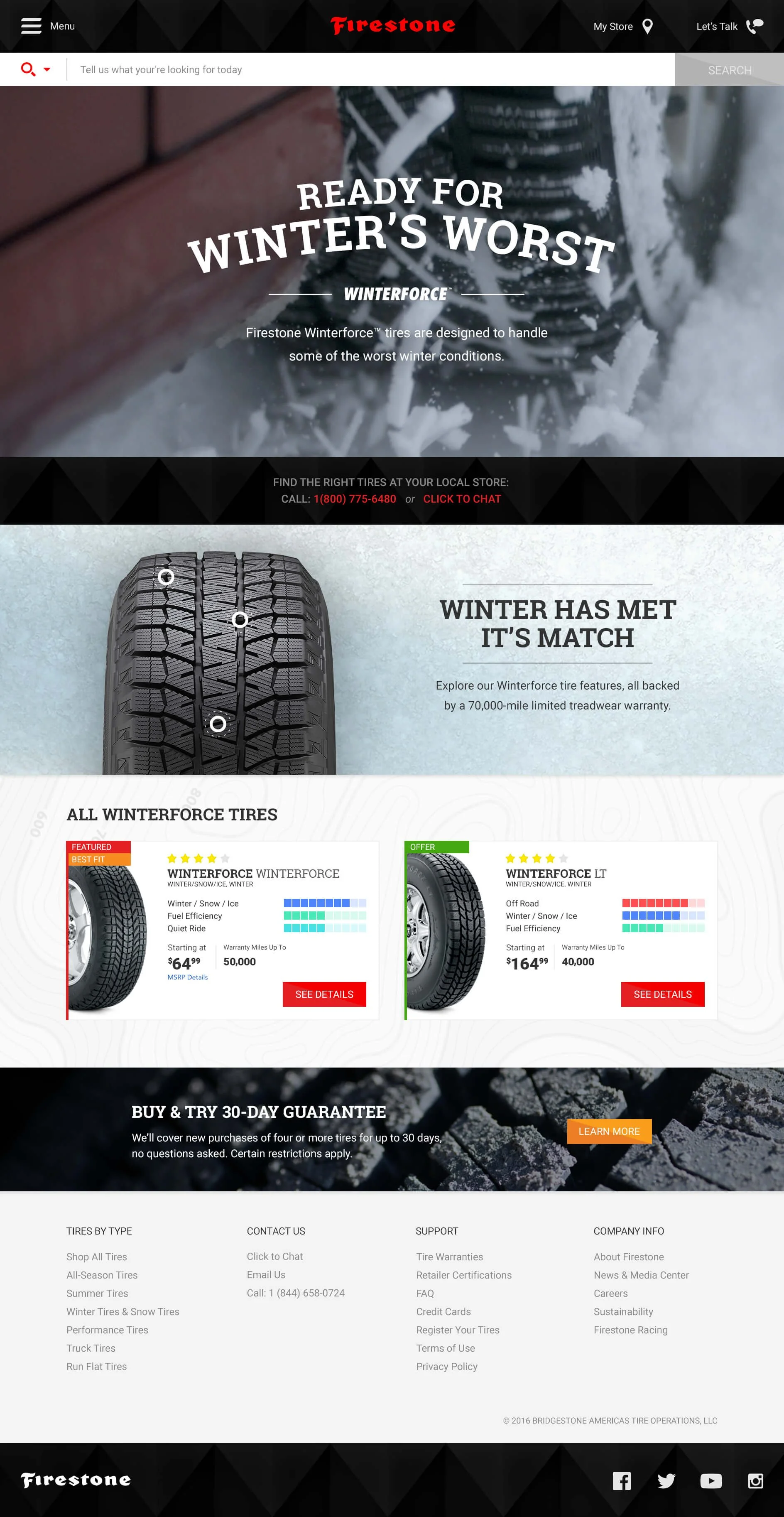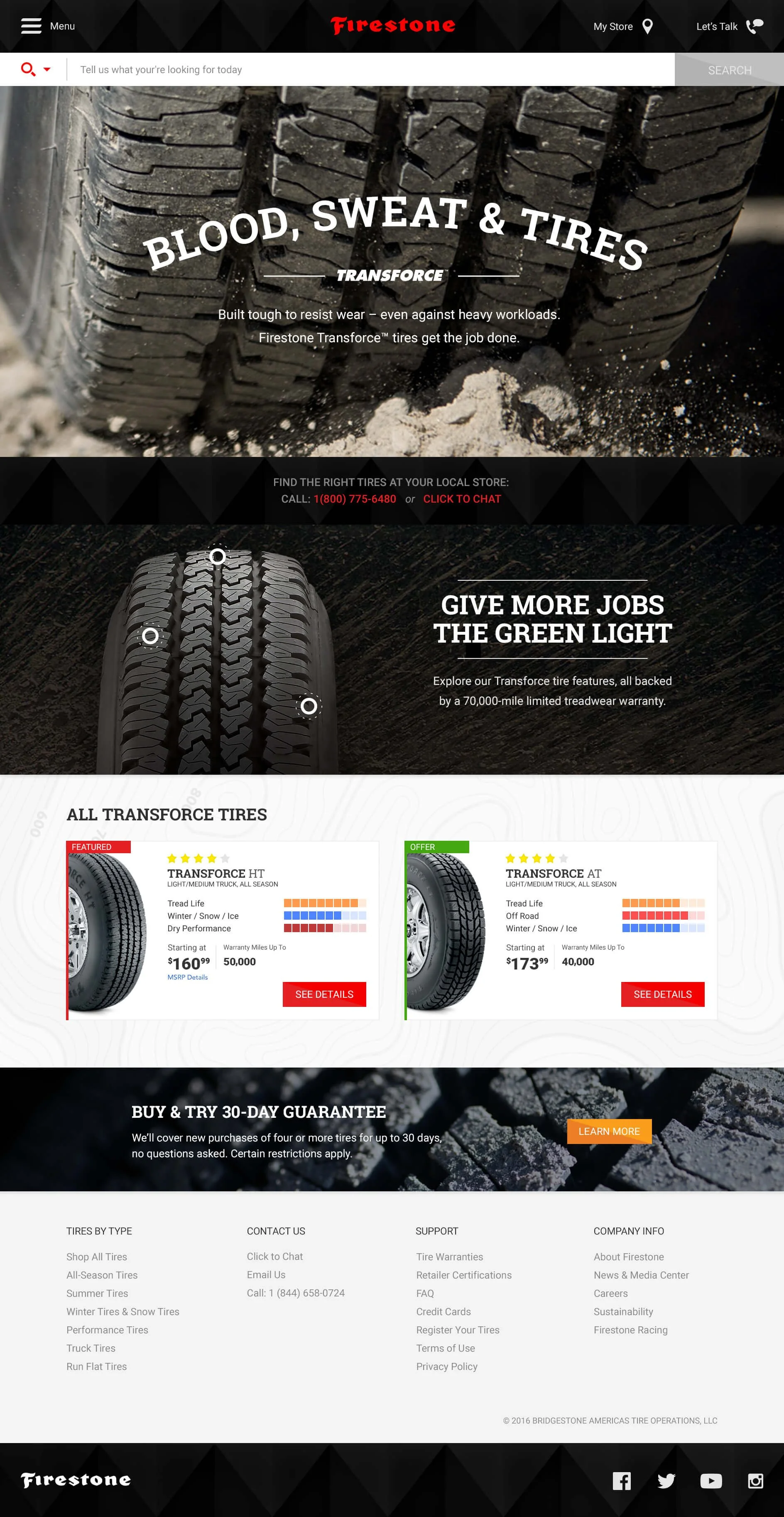 People who fit their vehicles with Firestone tires tend to be sticklers for detail. They want their hard-earned money to go far and the products they buy to do the same. So when Firestone came to us for their site redesign, they asked for a site that reinforced Firestone’s strong heritage of dependability and innovation, offered all the information a customer might need to make a decision, and launched as a commerce-ready platform that drove conversion on day one.