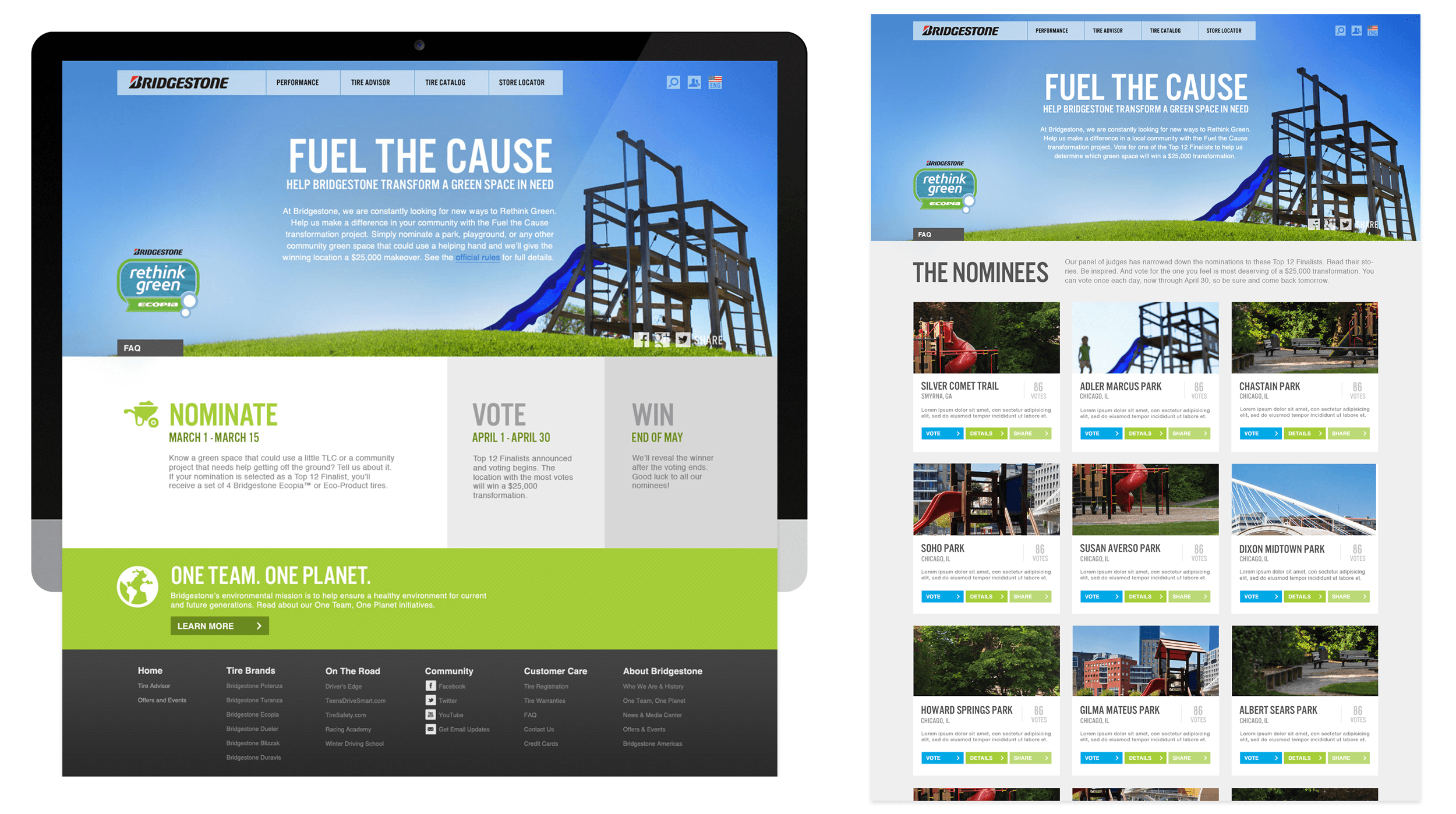 Bridgestone’s environmental mission is to help ensure a healthy environment for current and future generations. With that in mind, we set out to provide a park or community activity space in need with a $25,000 green space transformation. After the nomination phase passed and the finalists were selected, the voting phase began. Thousands upon thousands of votes poured in in support of the nominees. So many, in fact, that the winner’s prize was increased to $50,000 and the runner-up received the original $25,000 amount.